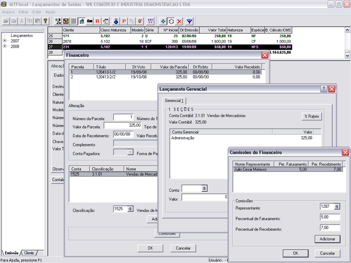 Integração financeira com valores por classificação, gerencial e comissões sobre vendas;