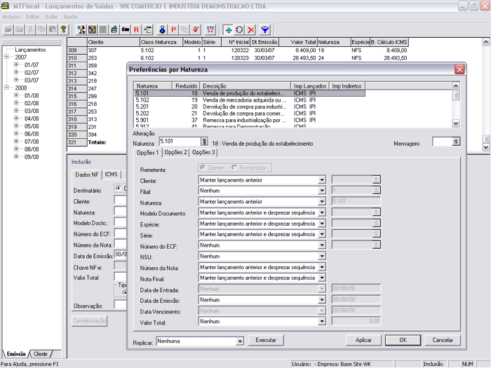 Preferências por natureza, onde o usuário define como deverão ser efetuados os lançamentos para cada natureza;