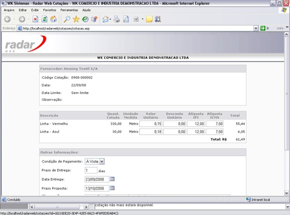 Cotações de preços pela Internet, diretamente com o fornecedor, sem intervenção de terceiros, eliminando-se processos manuais de envio de documentos impressos;